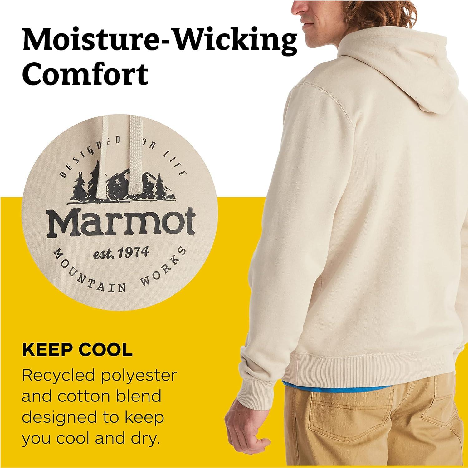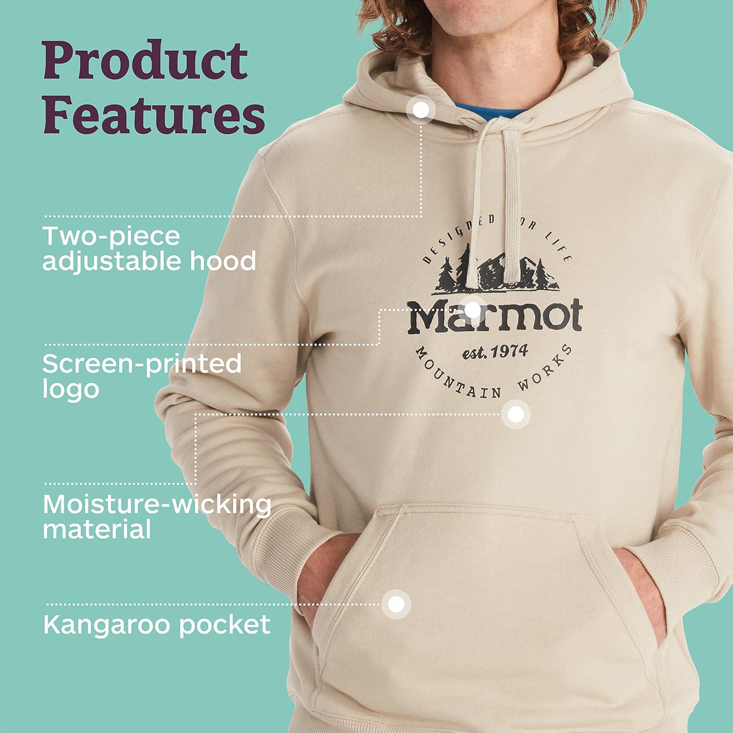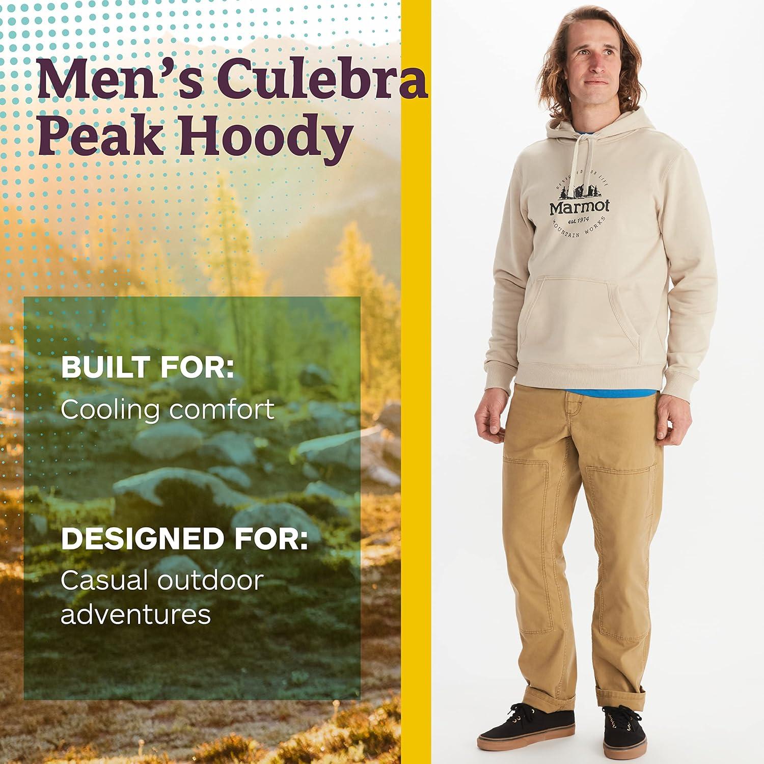 MARMOT Men’s Culebra Peak Hoody – Hooded Midweight Pullover Fleece Sweatshirt with Screen Printed Graphic and Kangaroo Pocket(Sandbar)