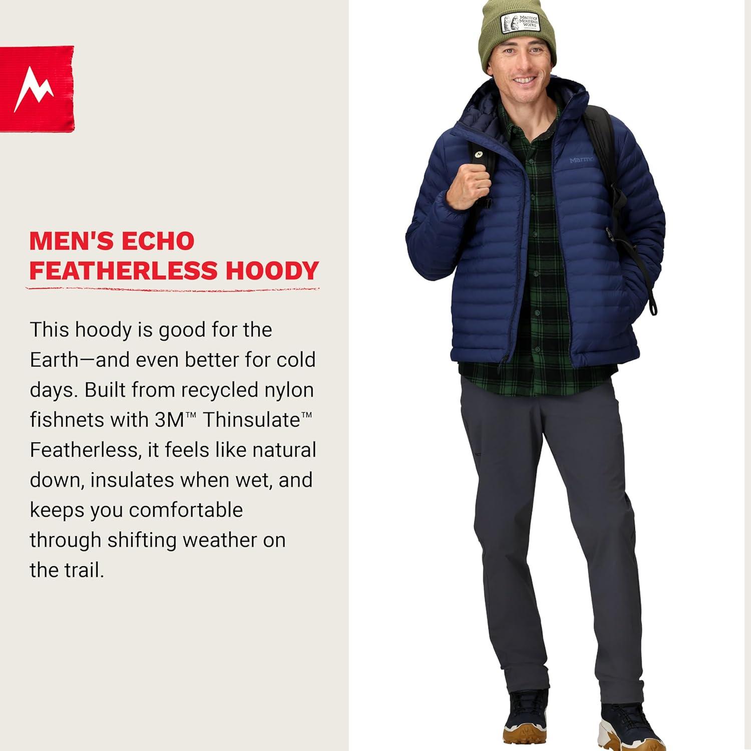 With a sleek design, the Marmot Echo Featherless Hoody for men is able to focus on performance. The raised collar fights off wind whether it is layered under a shell or not, and the 3M Thinsulate insulation traps body heat without weighing you down.