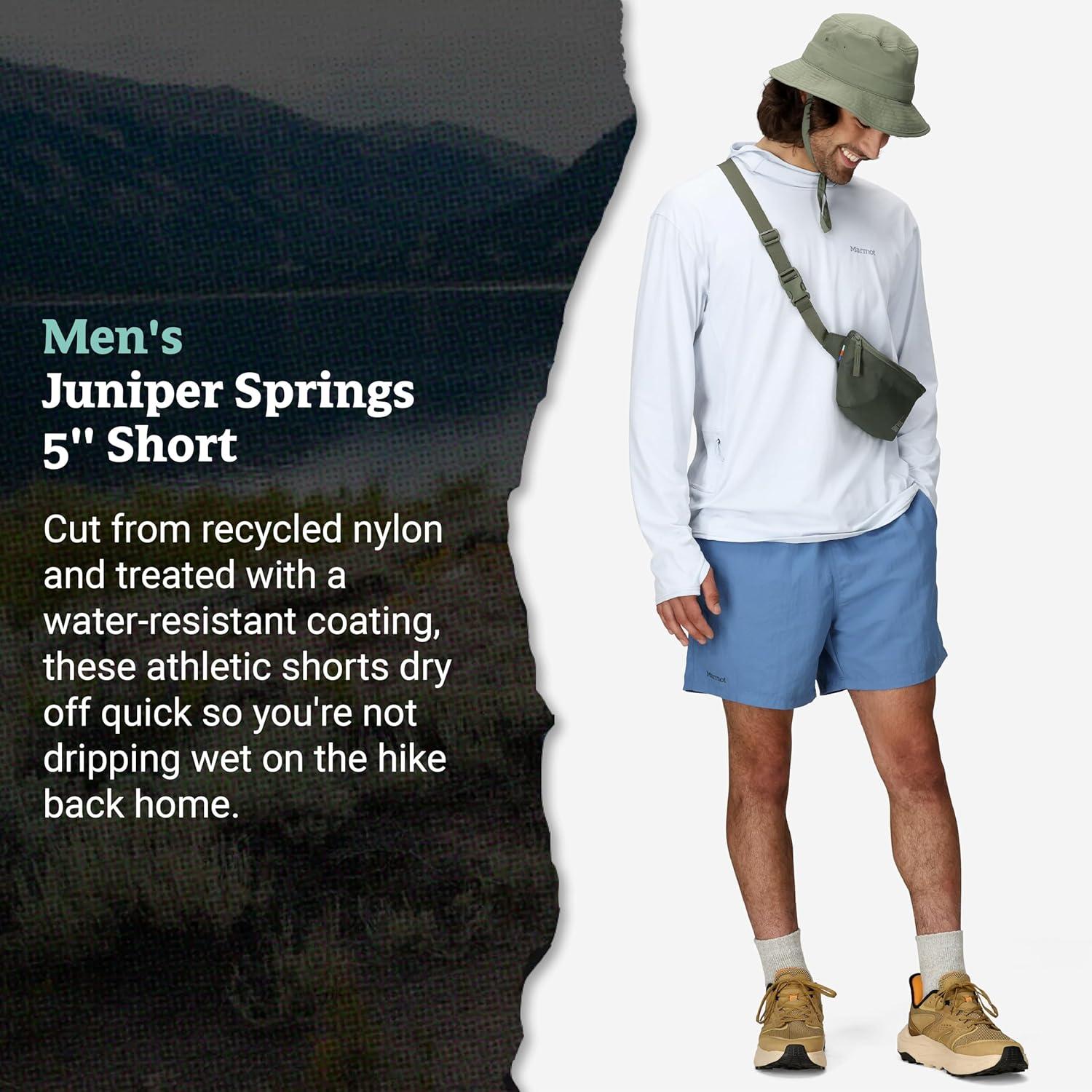 Hike to the lake and take the plunge in the Men's Juniper Springs 5″ Short. Cut from recycled nylon and treated with a water-resistant coating, these athletic shorts dry off quick so you're not dripping wet on the hike back home. A UPF of 50 means you'll stay protected on sunny days in wild places.