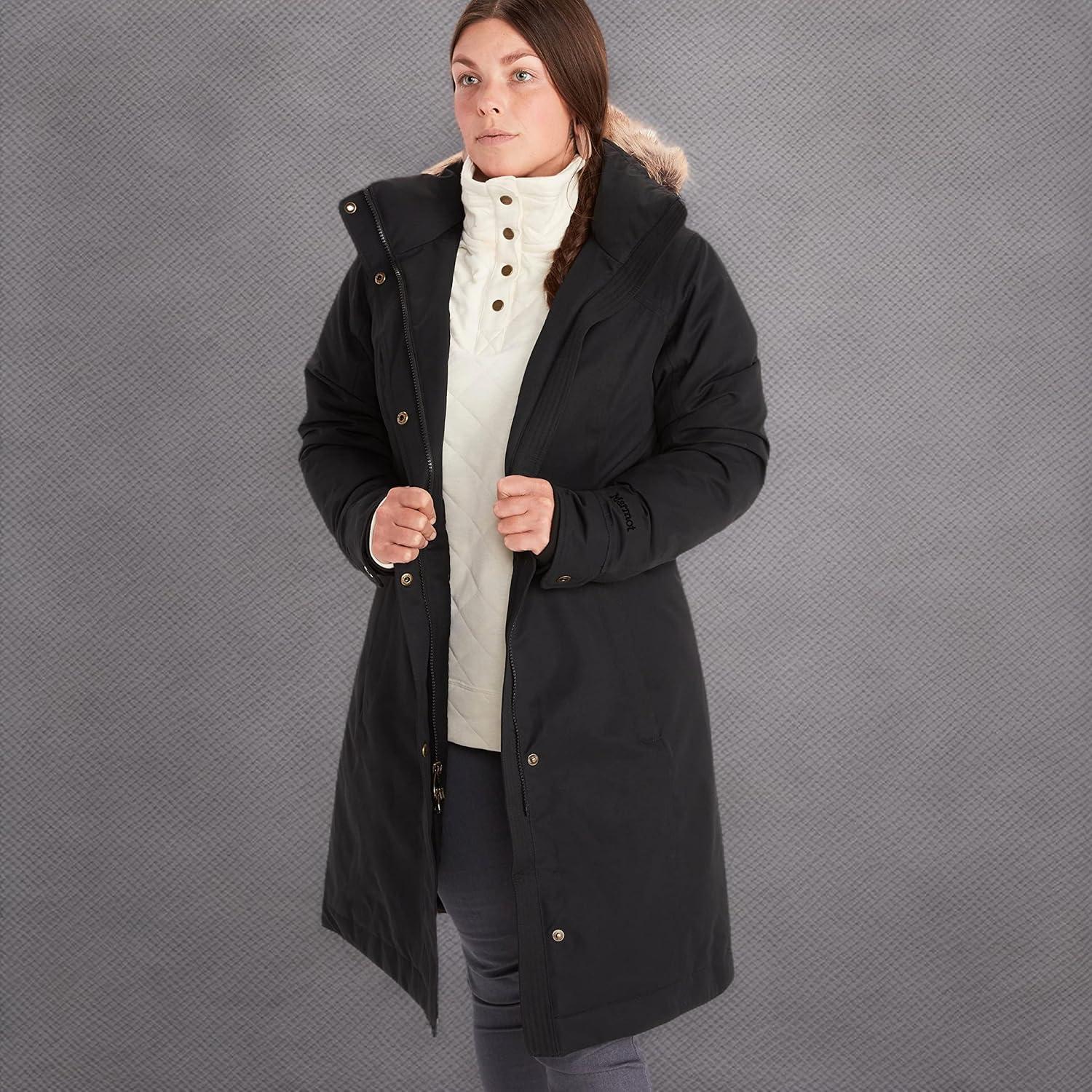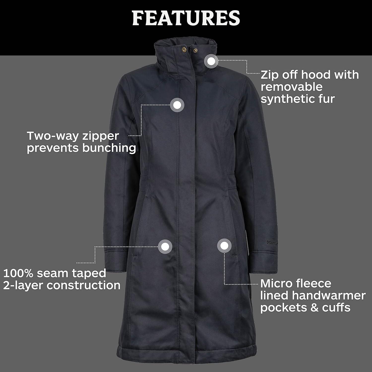 Distinct, urban-chic lines and minute details camouflage the serious technical prowess of the waterproof, insulated Women's Chelsea Coat. Sized specifically for women, this full-length coat starts with Marmot MemBrain®, is stuffed with 700-fill-power goose down, and features a zip-off hood with a removable fur ruff plus zippered handwarmer pockets.