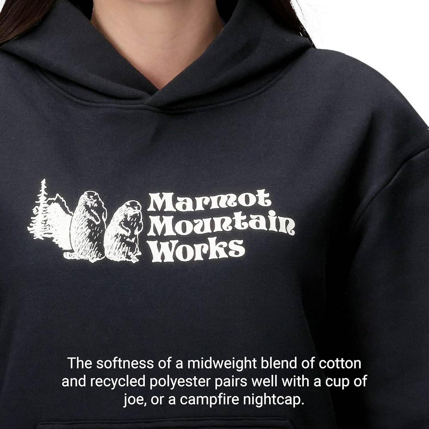 This midweight blend of cotton and recycled polyester embodies your outdoor lifestyle, with a softness that's ideal for pre/post activity or hanging by camp, and featuring a heritage Marmot mountain works logo. The Marmot Mountain Works Hoody is here to out-cozy all the competition. It goes on first thing in the morning for a dog walk, coffee run, or a stoke of last night's campfire, and it's the last thing you take off, if you take it off at all, before you hit the hay or the side zips on the sleeping bag. The softness of a midweight blend of cotton and recycled polyester pairs well with a cup of joe, or a campfire nightcap. It's the sweatshirt that's never more than an arm's length away, from the crag, to the couch, to the trunk of your car, at the ready to warm you up or comfort your cool down.