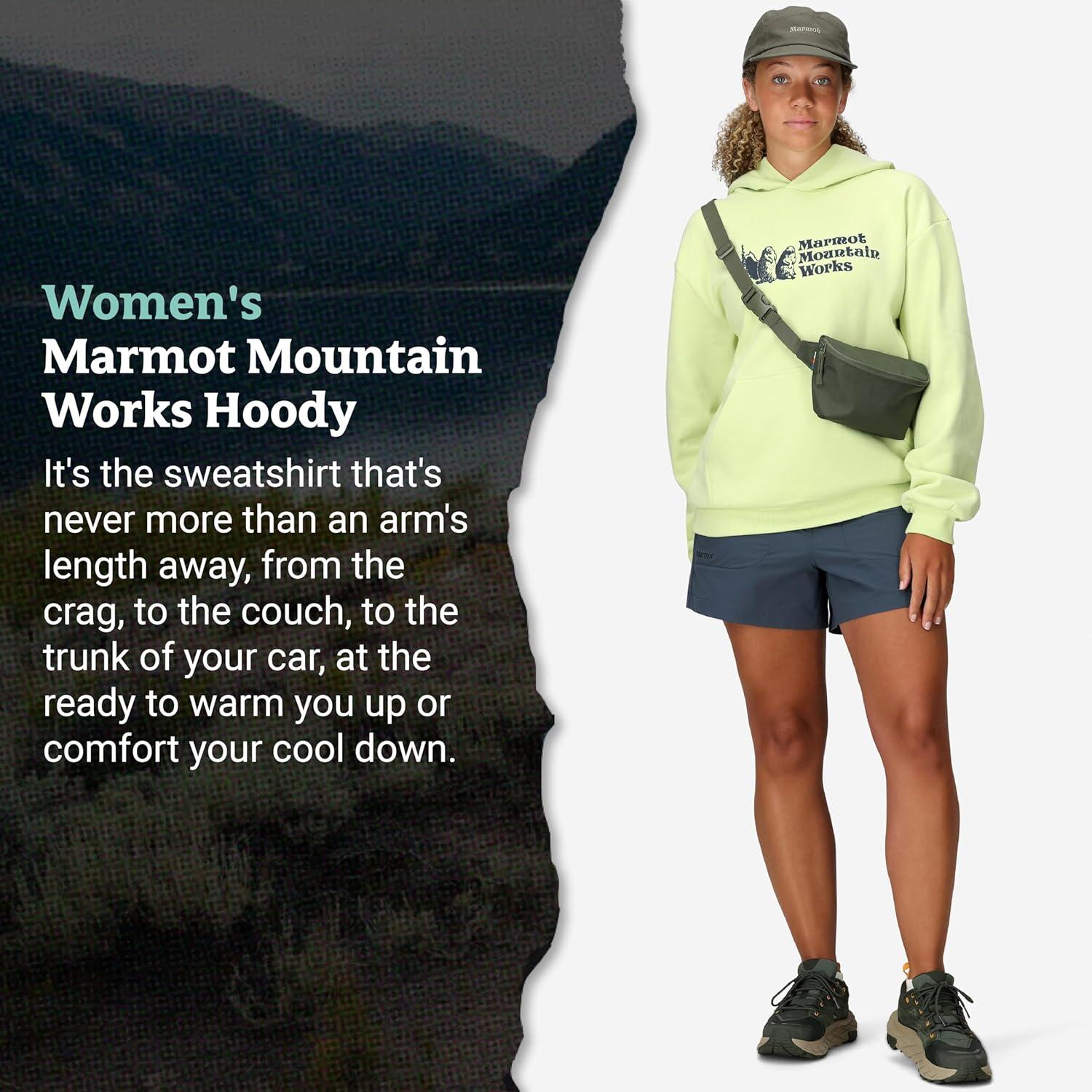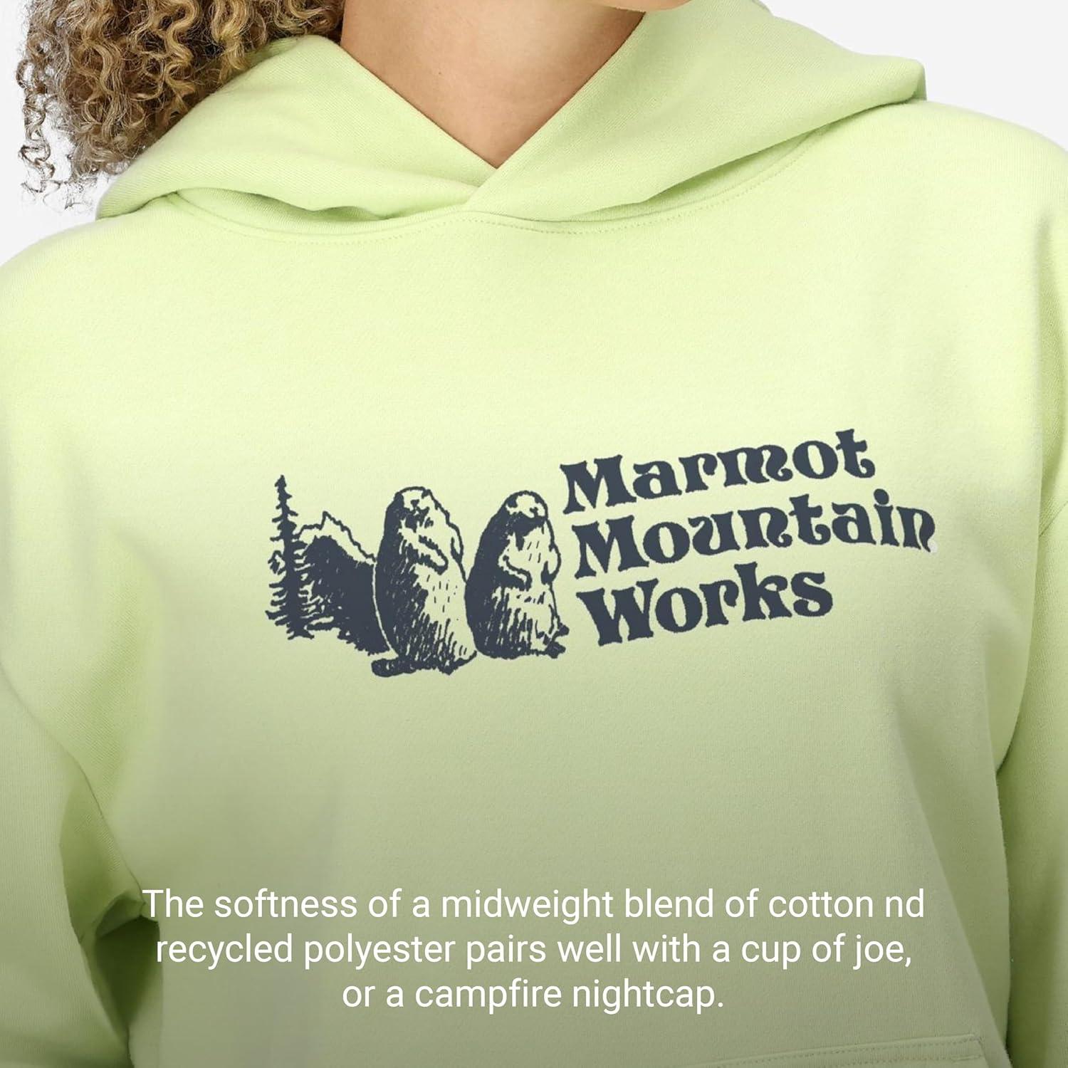 This midweight blend of cotton and recycled polyester embodies your outdoor lifestyle, with a softness that's ideal for pre/post activity or hanging by camp, and featuring a heritage Marmot mountain works logo. The Marmot Mountain Works Hoody is here to out-cozy all the competition. It goes on first thing in the morning for a dog walk, coffee run, or a stoke of last night's campfire, and it's the last thing you take off, if you take it off at all, before you hit the hay or the side zips on the sleeping bag. The softness of a midweight blend of cotton and recycled polyester pairs well with a cup of joe, or a campfire nightcap. It's the sweatshirt that's never more than an arm's length away, from the crag, to the couch, to the trunk of your car, at the ready to warm you up or comfort your cool down.