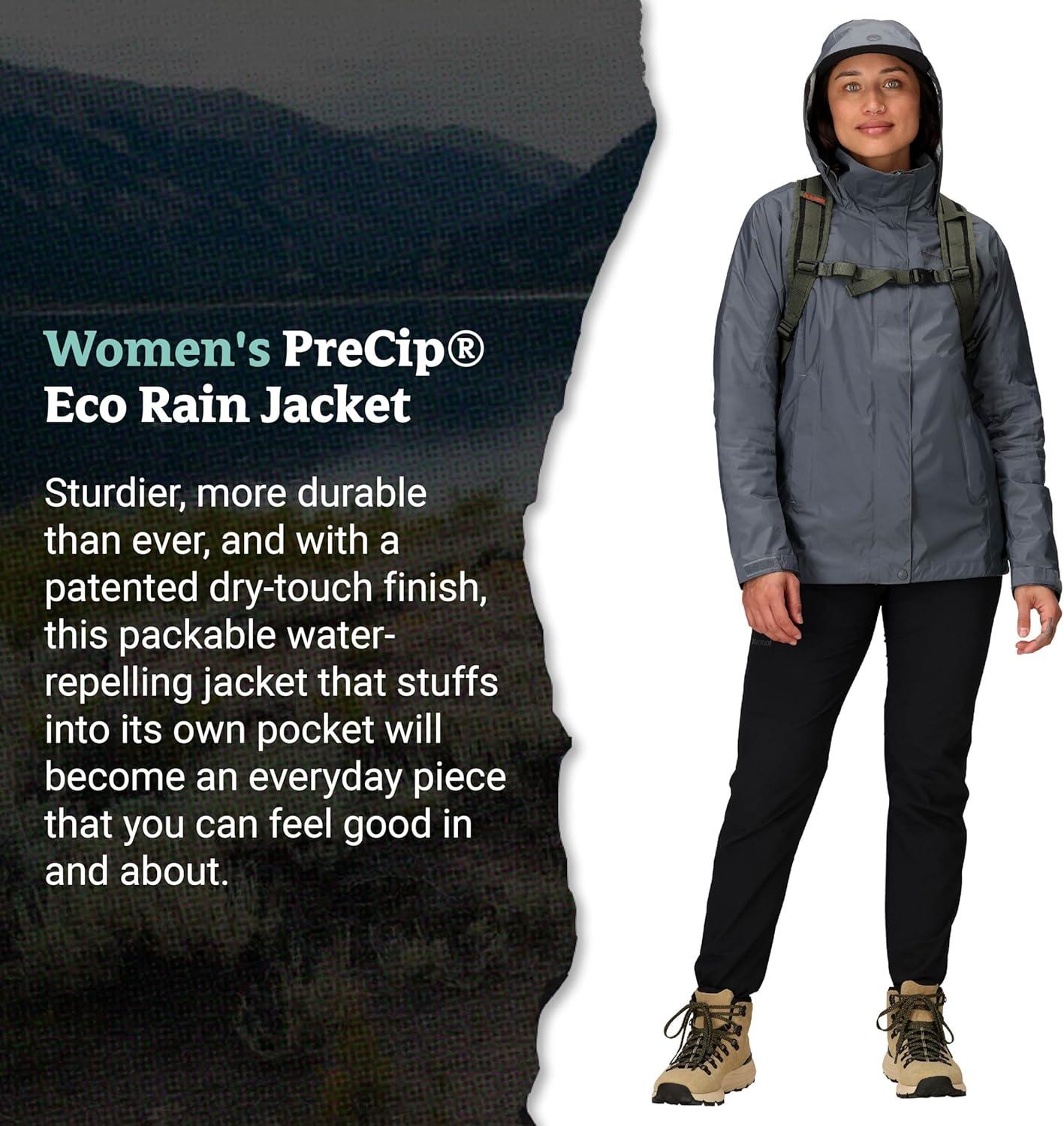 Introducing the next-gen high-performance waterproofing: the lightweight Women's PreCip Rain Jacket. Its waterproof, breathable, PFC-free Marmot NanoPro recycled nylon face fabric endures longer, thanks to advanced microporous coating technology. Tougher and more durable, with a patented dry-touch finish, this packable, water-repelling jacket fits into its own pocket, becoming a daily essential. It features a stowable hood, adjustable hem, and heat-releasing pit zips. The DriClime-lined chin guard wicks away moisture to prevent chafing.